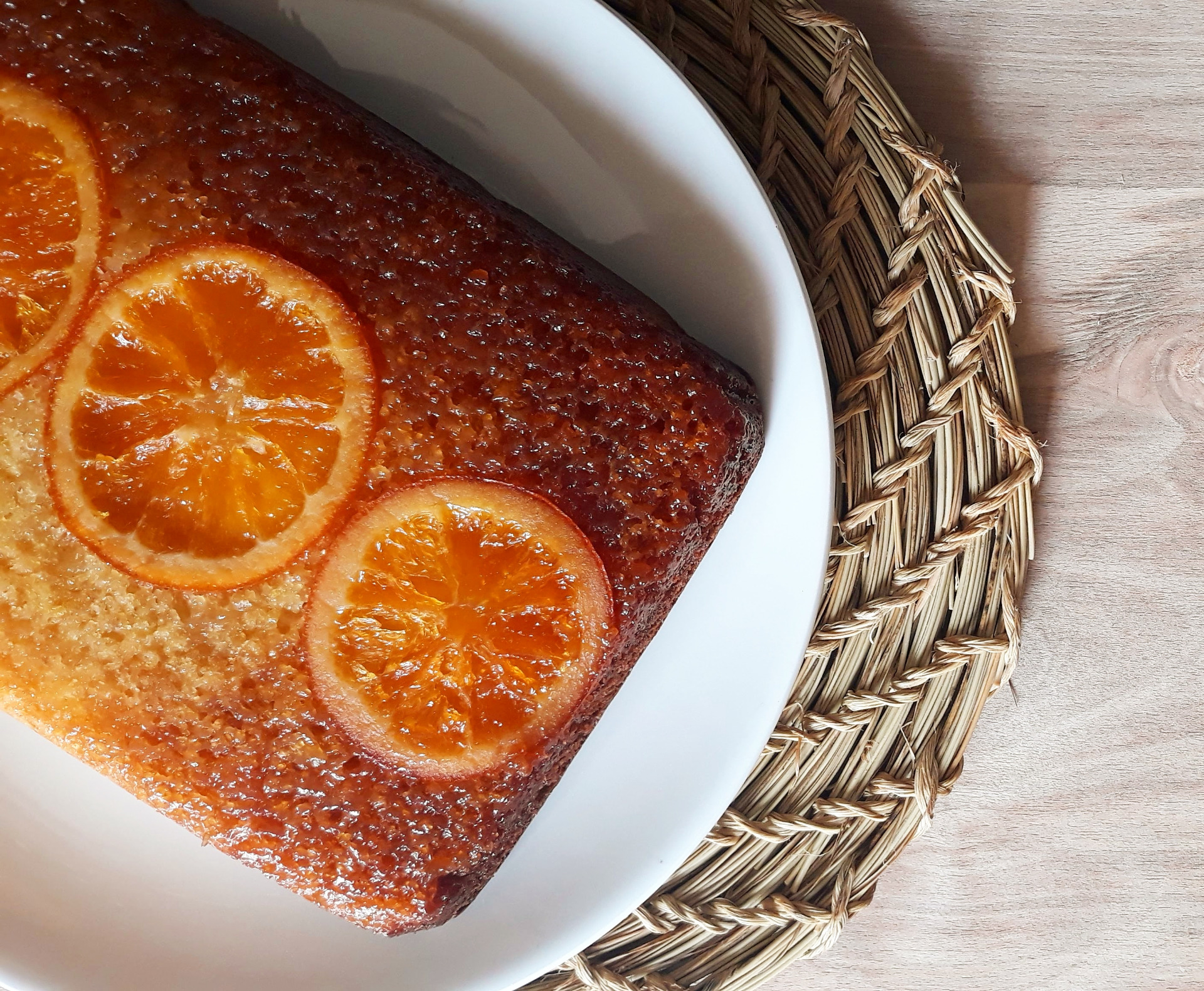 rodajas de naranja y por último la masa de bizcocho.
